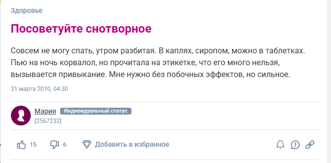 Типичный запрос. Первое, что обычно начинают искать люди, столкнувшиеся с нарушением сна, – «хорошее снотворное». Под этим сообщением на форуме woman.ru развернулась довольно активная дискуссия со множеством советов.
