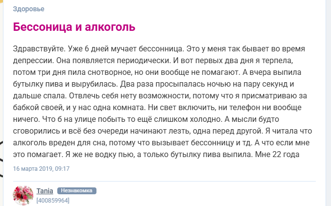 Алкоголь как средство от бессонницы тоже обсуждают на форумах.