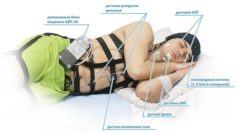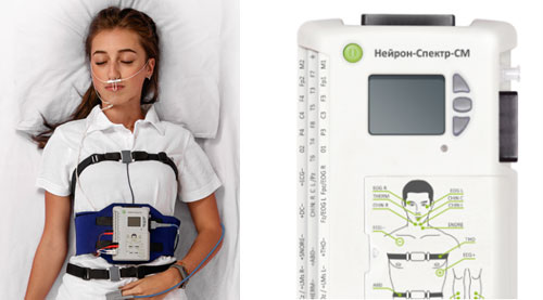 При более выраженных симптомах, таких как очень сильная дневная сонливость, или если пациент жалуется, что не спит всю ночь, применяется полисомнография. В данном случае также используются датчики, подсоединенные к прибору, они регистрируют движения глаз, активность мозга и другие показатели, – это более детальное исследование, чем во время кардиореспираторного мониторинга.