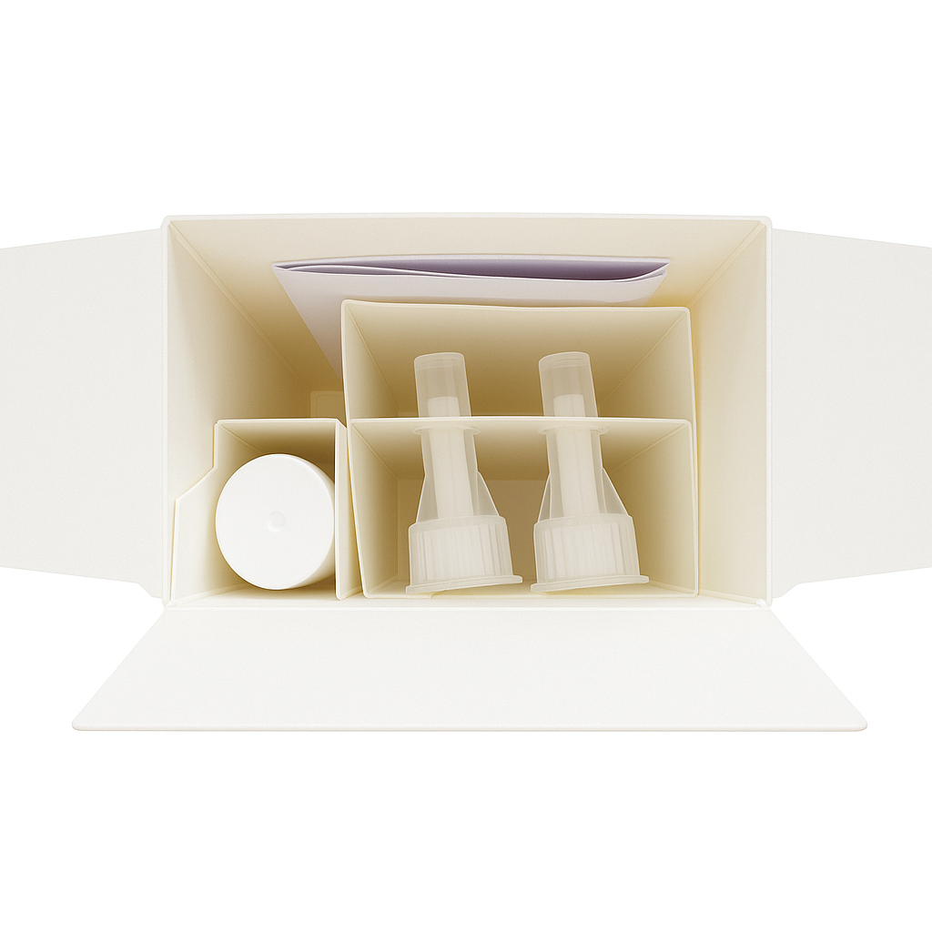 — Бывают случаи, когда у фармкомпании уже разработана картонная пачка с определенным дизайном, и пересматривать параметры упаковки не хочется. Но флакон, подобранный для лекарственного препарата, меньшего размера, чем нужно для такой пачки. Чтобы он не смещался внутри упаковки, заказчик попросил зафиксировать его. Мы решили эту проблему с помощью внутренней вставки — перегородки. Она ограничивает «свободу движения» флакона в упаковке, чтобы он не перемещался неконтролируемо. С помощью перегородки также можно разделить пространство упаковки и поместить в нее два флакона, если курс лечения состоит из двух частей.