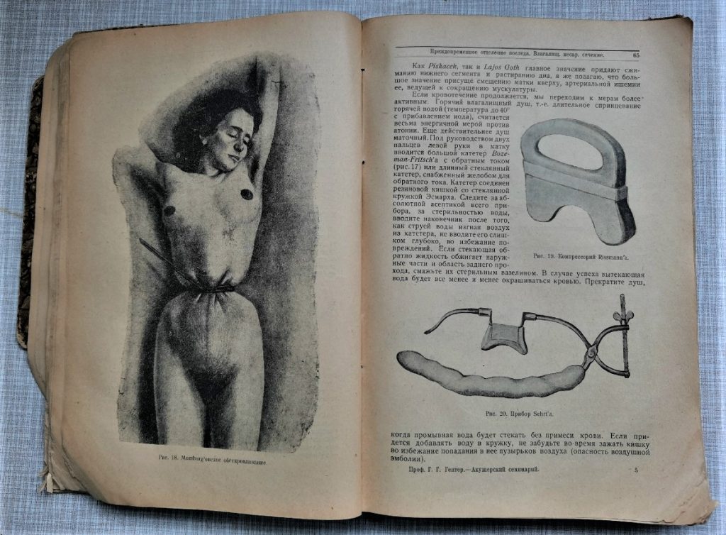 «Обычно начинают с мер менее активных, мирных, переходя в случае надобности к вмешательствам все более и более серьезным и даже героическим», — поясняет профессор в публикации. Борьбу с кровотечением он рекомендовал начинать с длительного спринцевания влагалища горячей водой с йодом при температуре до 40°. Следующей мерой он называл маточный душ, при котором горячая вода подается в матку через катетер, снабженный желобом для обратного тока. Насколько болезненна могла быть эта процедура для пациентки, можно судить по рекомендации смазывать от обжигания наружные части тела вазелином.