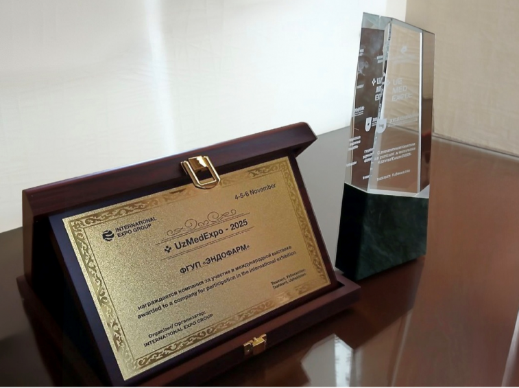 ФГУП «Эндофарм» отмечен International Expo Group за активную презентационно-выставочную деятельность и продуктивное сотрудничество с Республикой Узбекистан в области дистрибьюции лекарственных препаратов. Церемония награждения состоялась в рамках XVII Международной медицинской выставки «UzMedExpo-2025», проходившей в Ташкенте с 4 по 6 ноября 2025 года.
