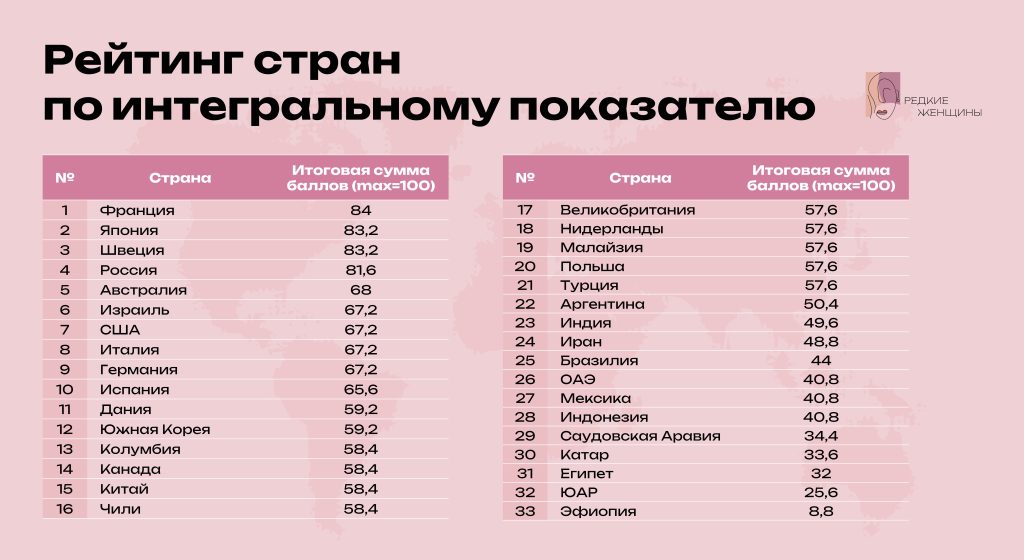Всего были исследованы 33 страны в 6 регионах мира: Европа, Северная Америка, Латинская Америка, Азия, Ближний Восток и Африка. На основе собранных данных для каждой страны был рассчитан интегральный показатель, отражающий уровень системной защищенности и поддержки женщины в контуре орфанной помощи. Ключевой методологический принцип исследования состоит в том, что оно оценивает степень интеграции этих мер в устойчивую систему сопровождения семьи, а не наличие отдельных мер само по себе. Показатель формируется на основе пяти ключевых критериев: наличие государственной политики в сфере орфанных заболеваний, разнообразие форм государственной финансовой поддержки семей, медицинская инфраструктура и система реабилитационной помощи, уровень институционального участия НКО и общественных организаций, а также иные меры поддержки, куда вошли дополнительные факторы, влияющие на качество жизни семьи, такие как образовательная поддержка, социальная поддержка, трудовые преференции, налоговые льготы и другие.